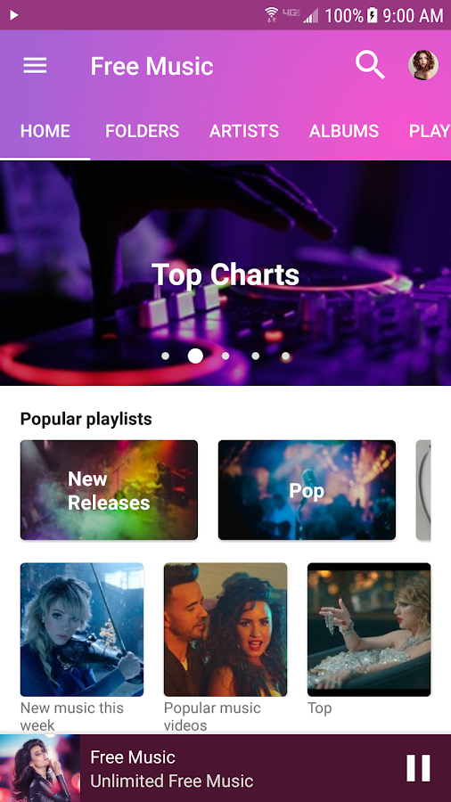Please note it's not a music downloader. No need to download songs anymore: save your time and access millions online songs. You can find any song in the endless YouTube catalog and also import your own YouTube playlists. You can listen to YouTube music while working in other apps with multi tasking enabled mini popup player. Free Music has a special power saving / player lock mode which helps to save battery and avoid accidental key presses during listening to music. You can also share any song from YouTube app to play using this app.